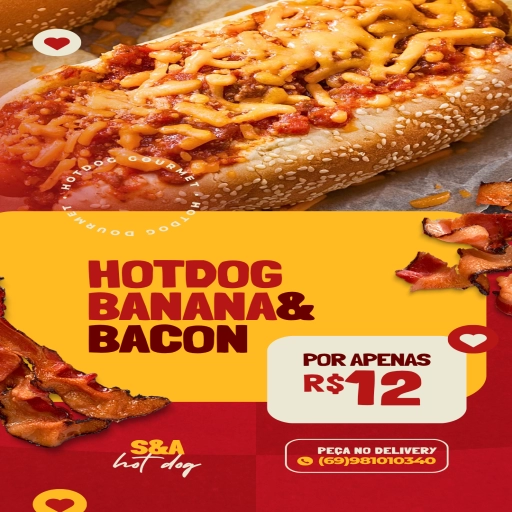 Pão, salsicha, molho, queijo mussarela, calabresa, bacon, banana, catupiry, milho e batata palha.